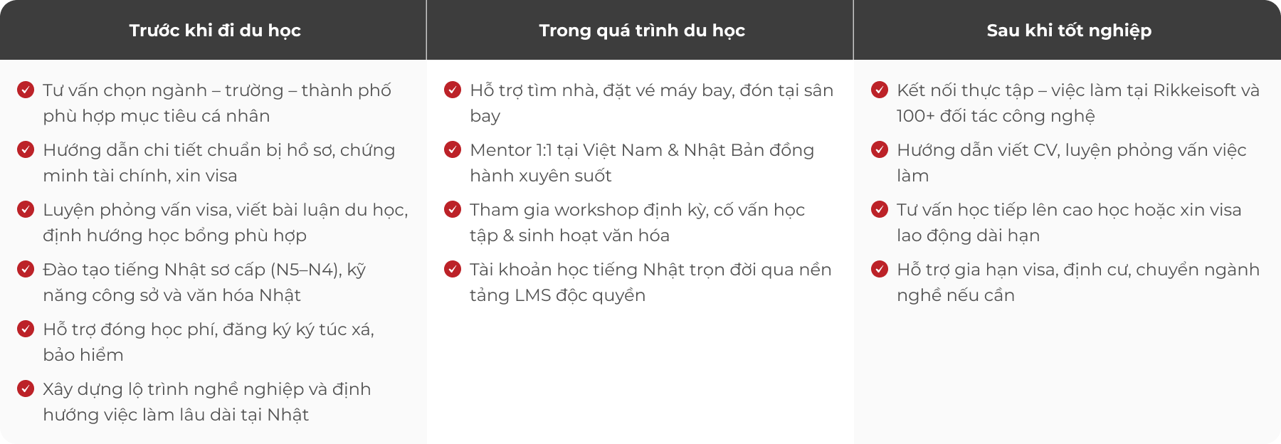 Sau khi học viên đặt chân đến Nhật, Rikkei Academy vẫn tiếp tục đồng hành qua mentor, các cộng đồng hỗ trợ, tư vấn pháp lý và định hướng nghề nghiệp dài hạn, giúp bạn yên tâm học tập, sinh sống và phát triển sự nghiệp lâu dài